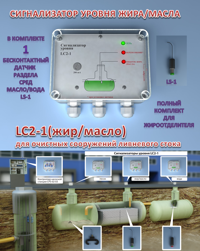 Устройство необходимо для контроля наполнения отсеков очистных сооружений сточных вод плавающими на поверхности масло-жировыми загрязнителями и плёнками.